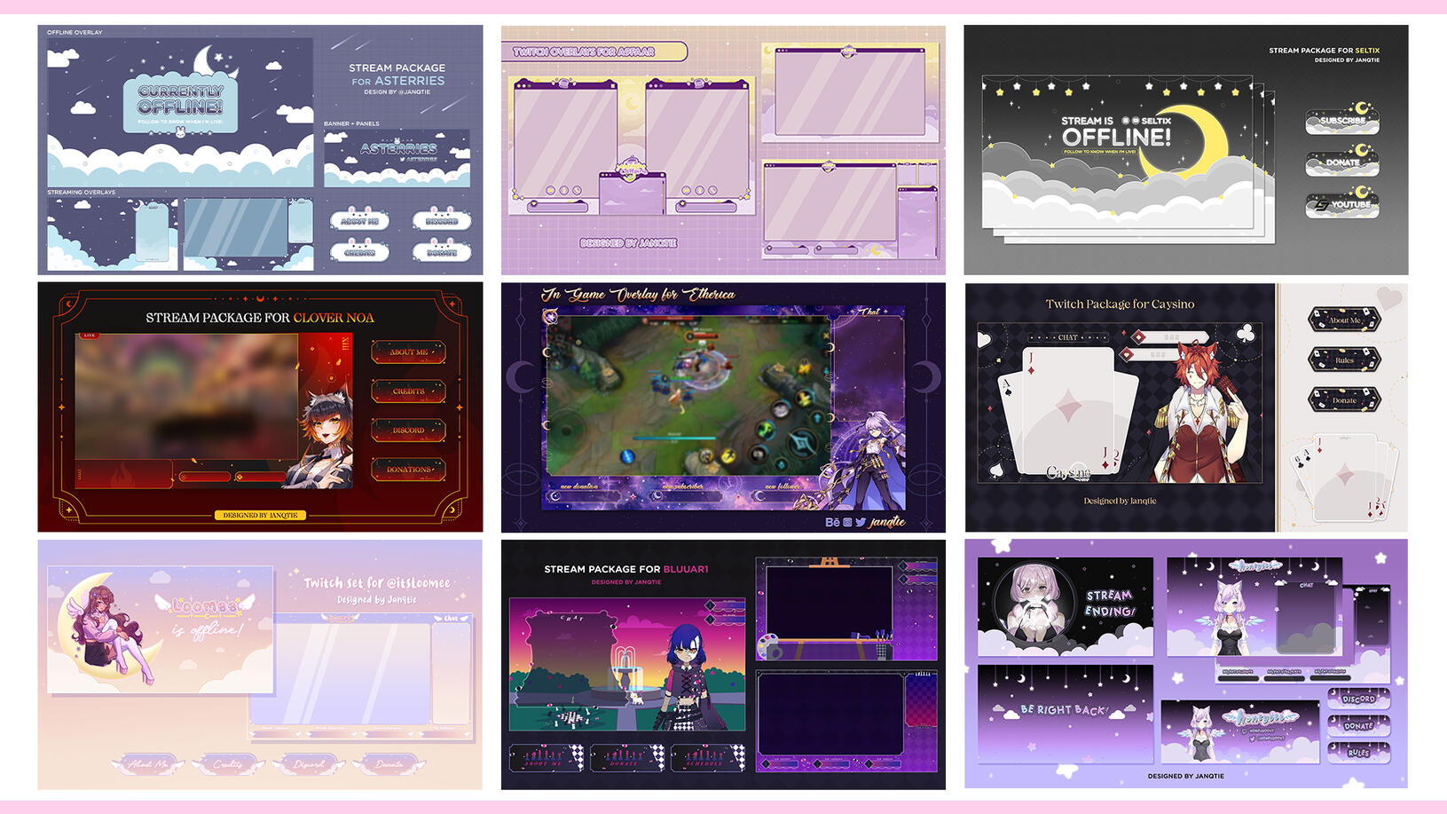 Hello! I am Jannie, a freelance graphic designer from NYC. I design cute vtuber and streamer assets!I also create free templates for streamers on my ko-fi. You can browse below if you are interested!